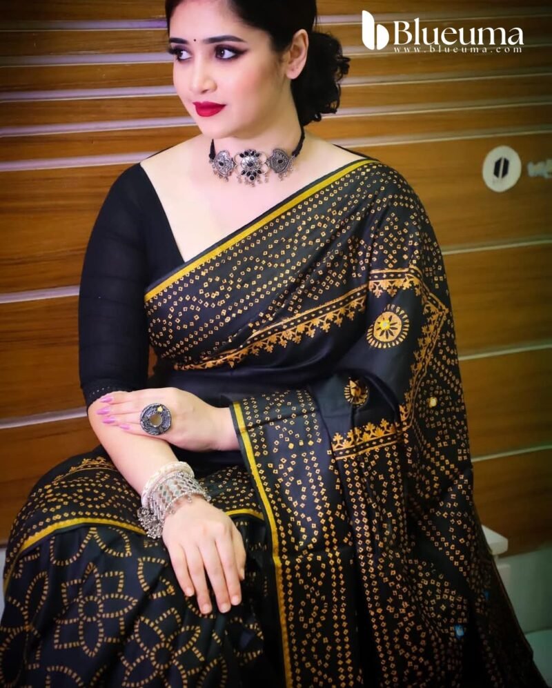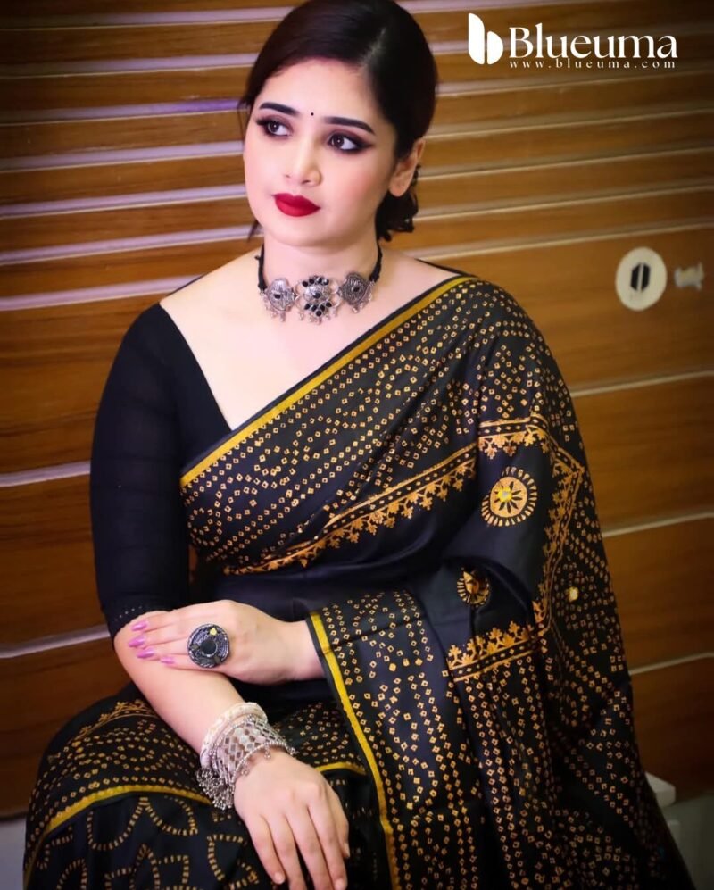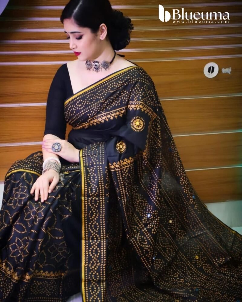 রেশমসিল্ক শাড়ী তে চুনডি ব্লক প্রিন্ট কাজ করা এবং ডলার বসানো কাজ।