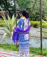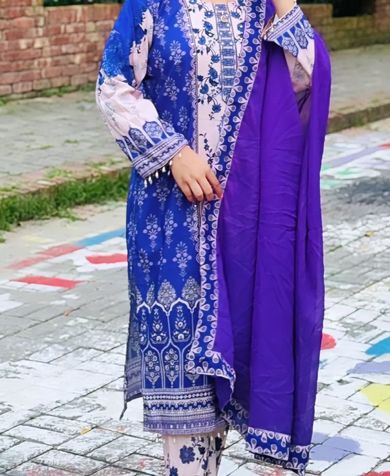 A luxurious Dubai Silk ready-made three-piece set featuring imported lace, artificial mirror work, and full-body digital embroidery. Premium finishing with guaranteed color and elegant shine.