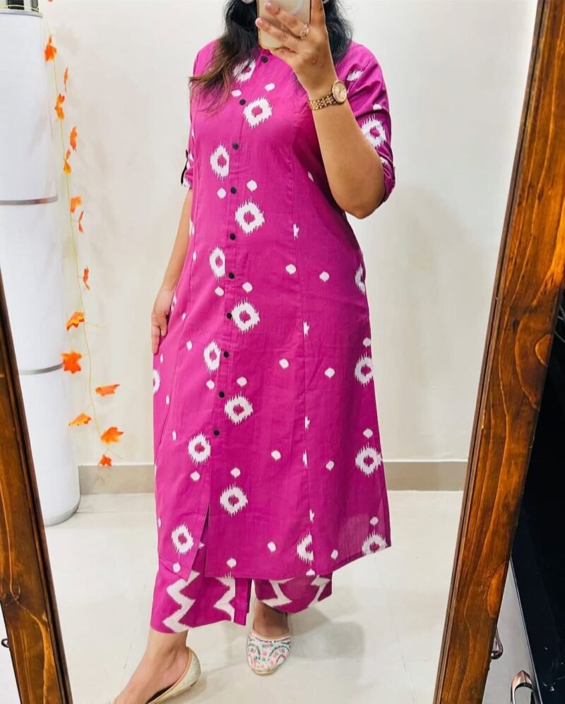 Add timeless elegance to your wardrobe with this Ready Made Skin Print Two Piece Set, featuring a beautifully printed Kurti (Kamij) and matching Salwar (Pant) – designed for comfort, style, and everyday wear.